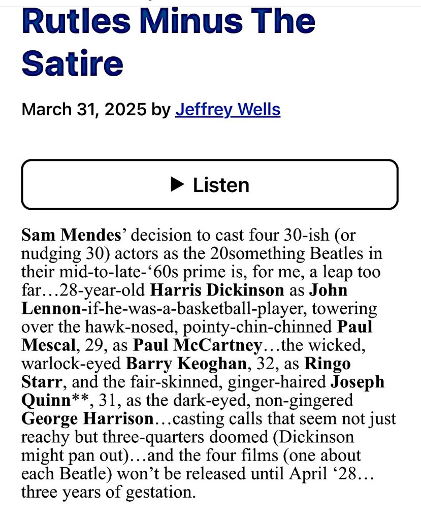 Ten months ago I mentioned that the four actors who will soon be playing the Fab Four in Sam Mendes’ quartet of Beatle flicks (due in early ‘28) are, being in their early 30s, are simply tooold to inhabit the original fellows.