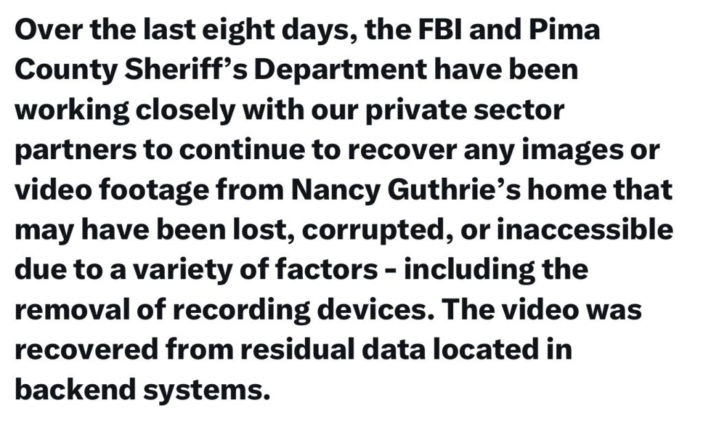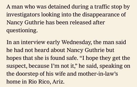 Posted four or five hours ago: “Veteran homicide investigator Paul Ciolino, who has worked with 48 Hours and CBS News as an on-air expert, says key elements of a true kidnapping aren’t present in the Nancy Guthrie case. With more than 25 years appearing on hundreds of programs across major U.S. and Canadian networks, Ciolino points to the lack of negotiations, forensic evidence, and planning signs as major red flags.”