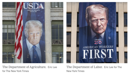 N.Y. Times, 2.19.26, reported by Ashey Ahn: “The banners follow a string of efforts by the administration to emblazon the president’s name and face on everything from coins to national park passes.