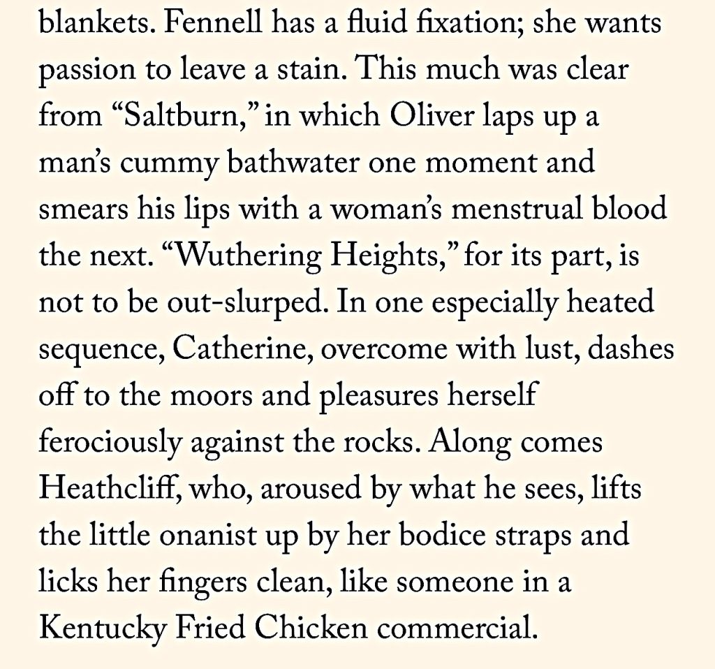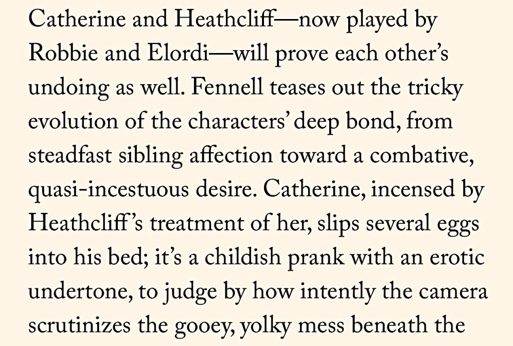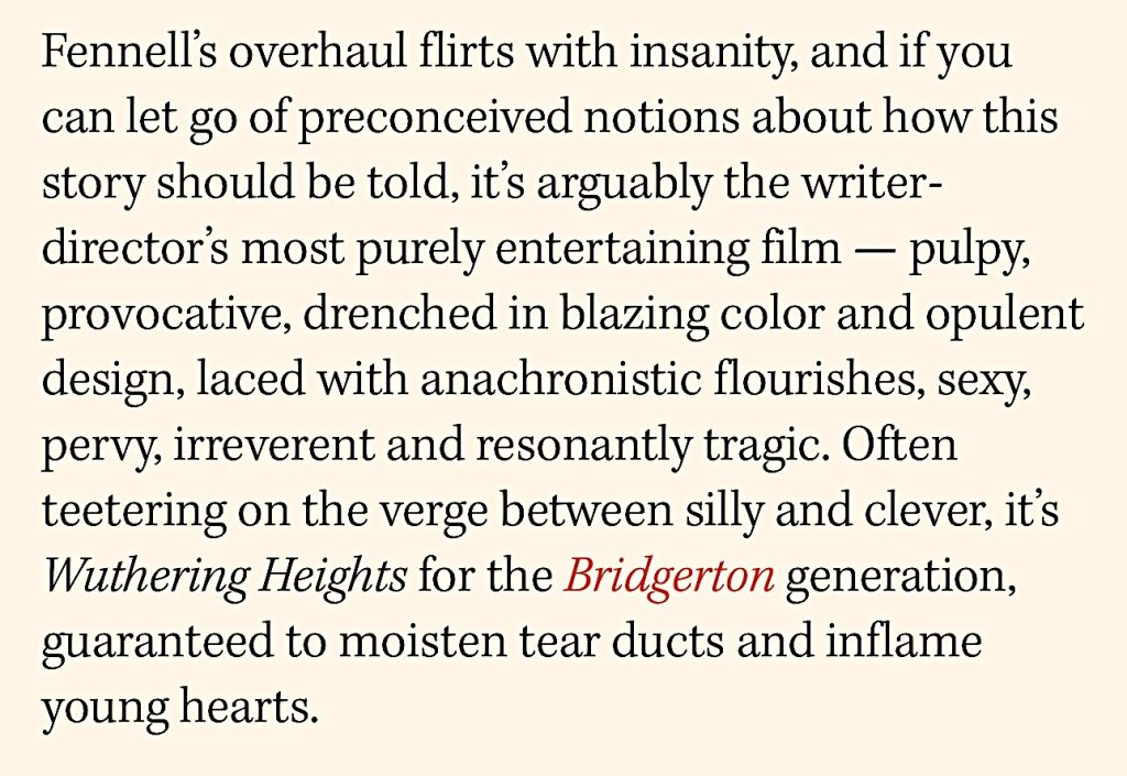 I can’t wait to hate-watch Emerald Fennell’s Wuthering Heights (Warner Bros., 2.13). I’m tasting the resins as we speak. Nobody despises 21st Century woke presentism in English historical dramas (i.e., the Bridgerton syndrome) more than yours truly. I almost feel tumescent about this.