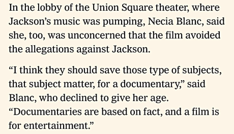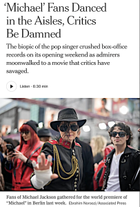 Woke Hollywood has no argument with any movie making big money, but Micheal is, from a certain avoidance perspective, an ethically barren, morally gutted film — a massive exercise in denial that basically says “forget about all that gnarly kid-diddling stuff…just have fun with the music and dancing and adoration of the fans.”